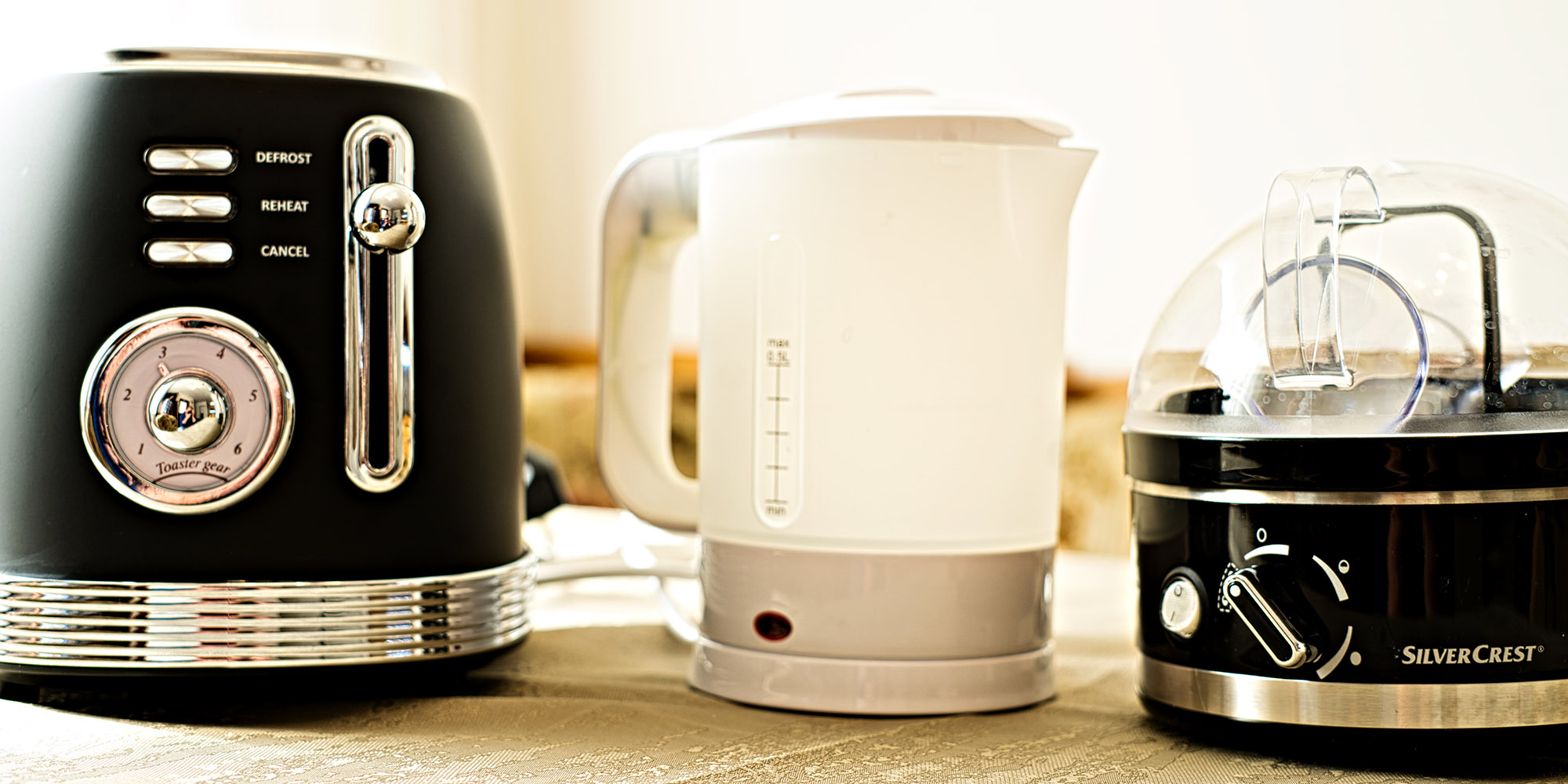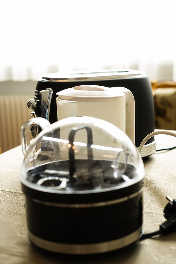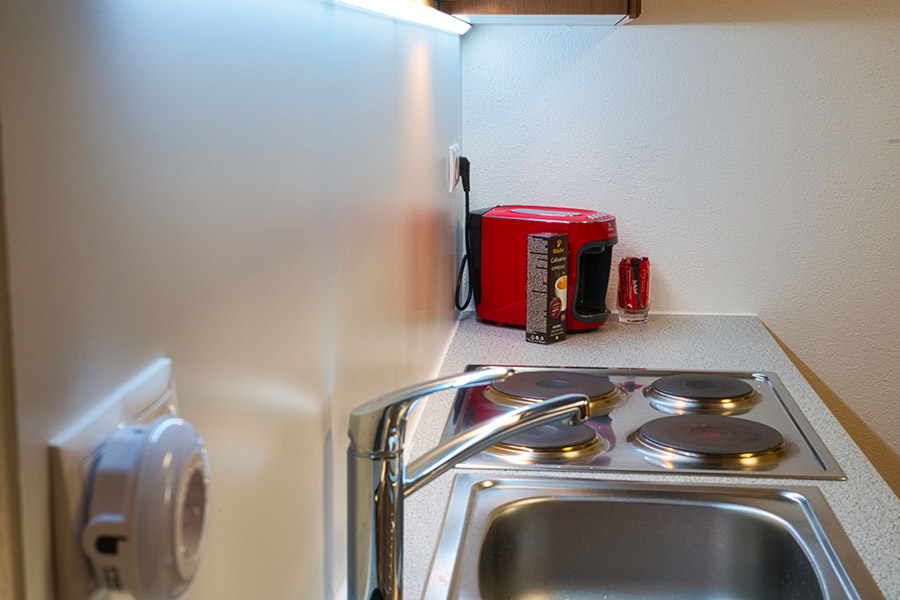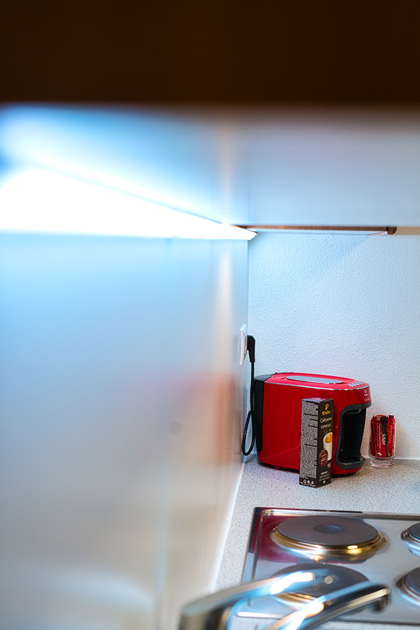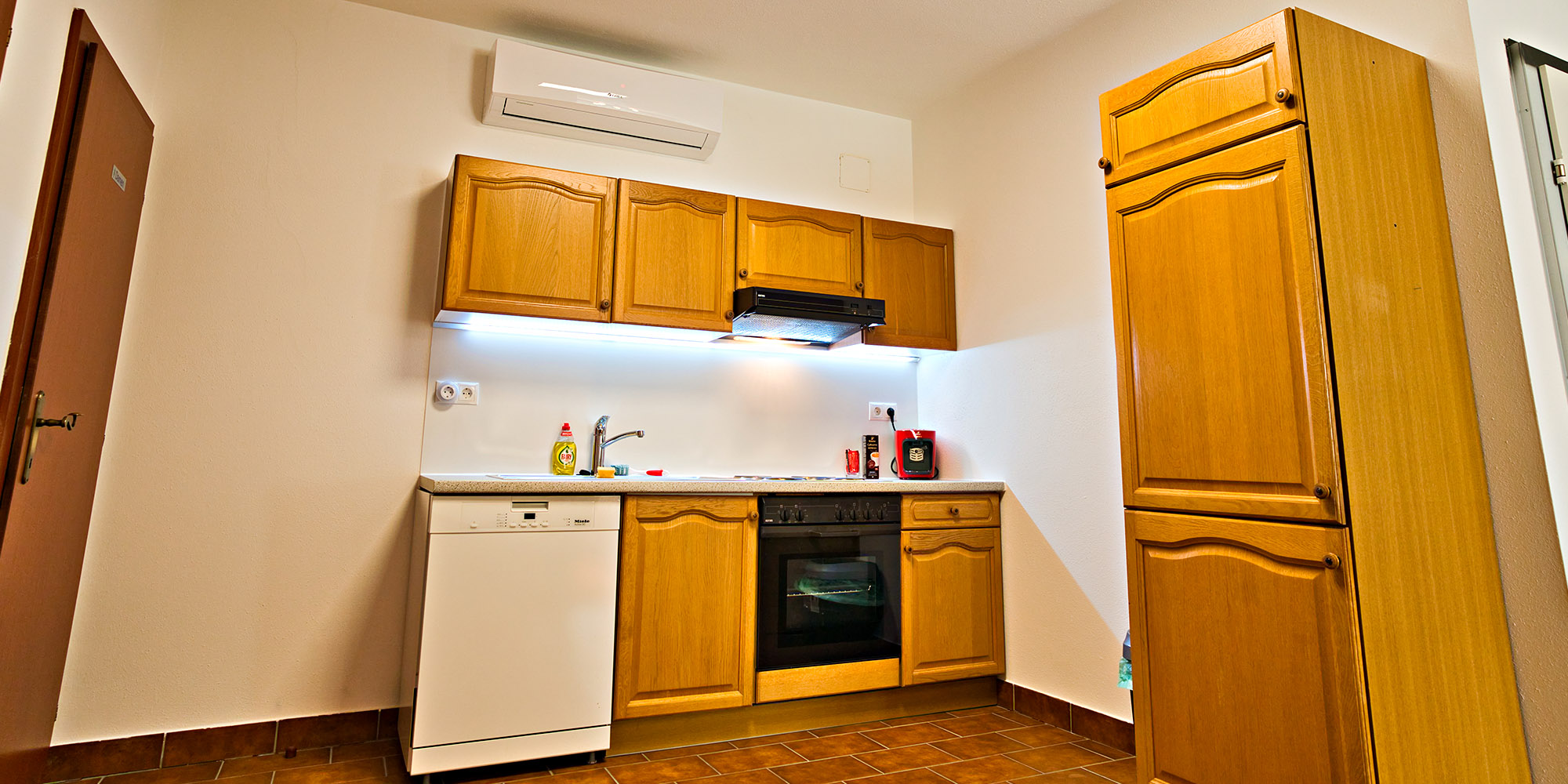 In der Küche sind alle zum Kochen benötigten Küchen Utensilien vorhanden die zum Kochen benötigt werden, Pfannen, Töpfe, Besteck, Messer, Schneidebretter, Teller Gläser, Tassen …… Auch Toaster, Eierkocher, Wasserkocher sind vorhanden. Tee und eine Tchibo Cafissimo Kapselmaschine mit einer Starterration steht zur Verfügung. Das schmutzige Geschirr übernimmt gerne der Geschirrspüler. Taps und Putz-Utensilien finden sie unter der Spüle.