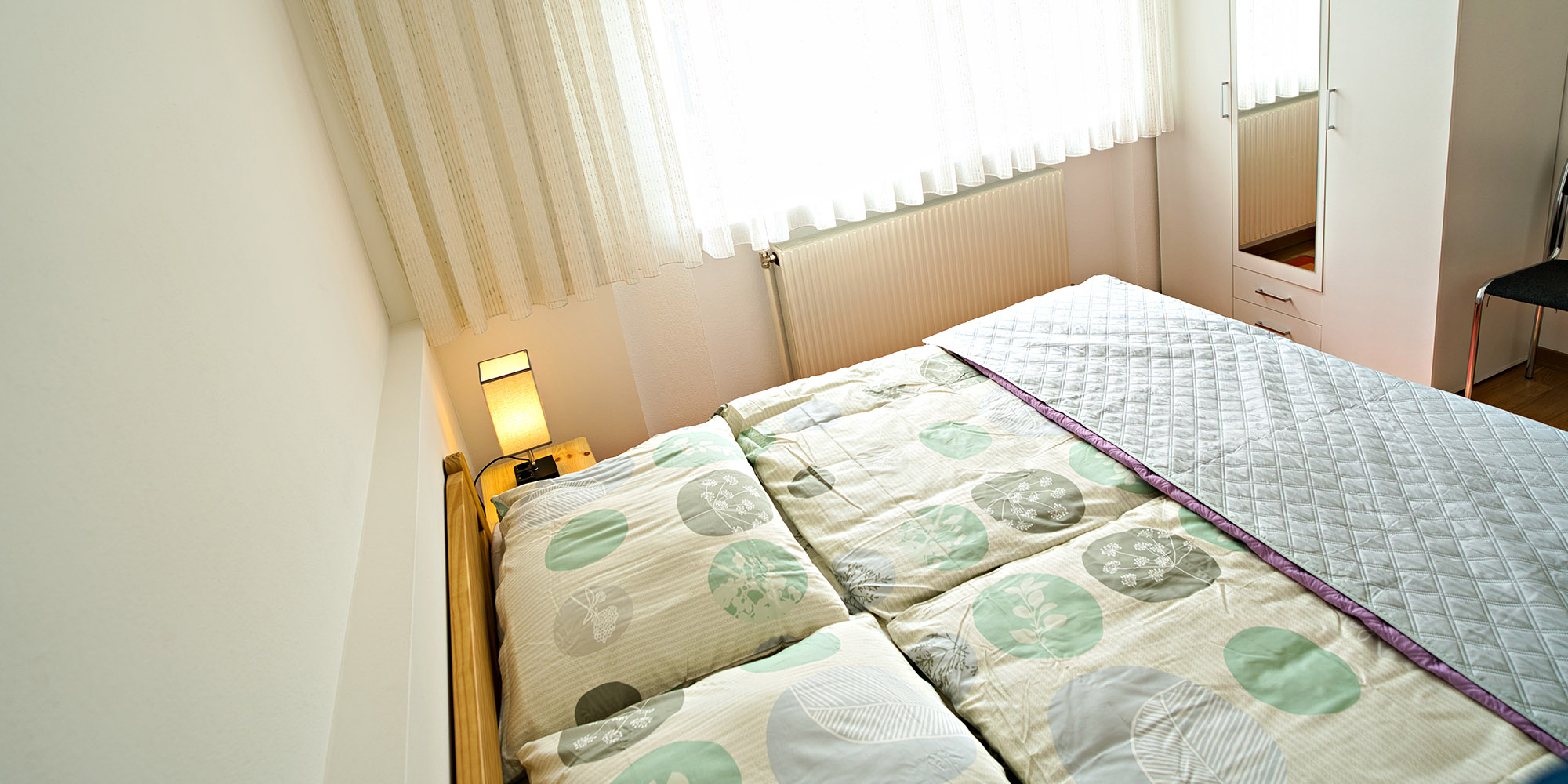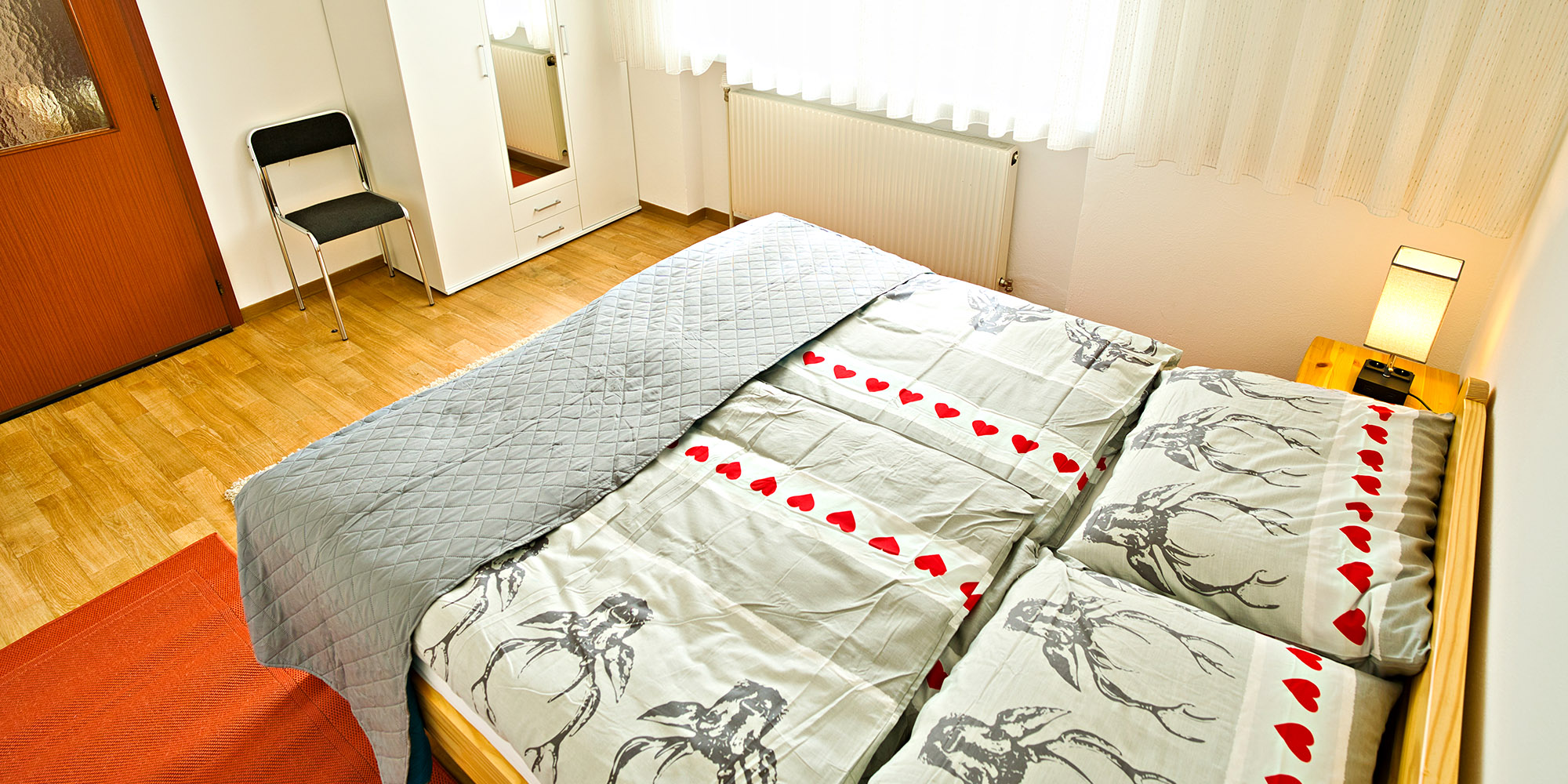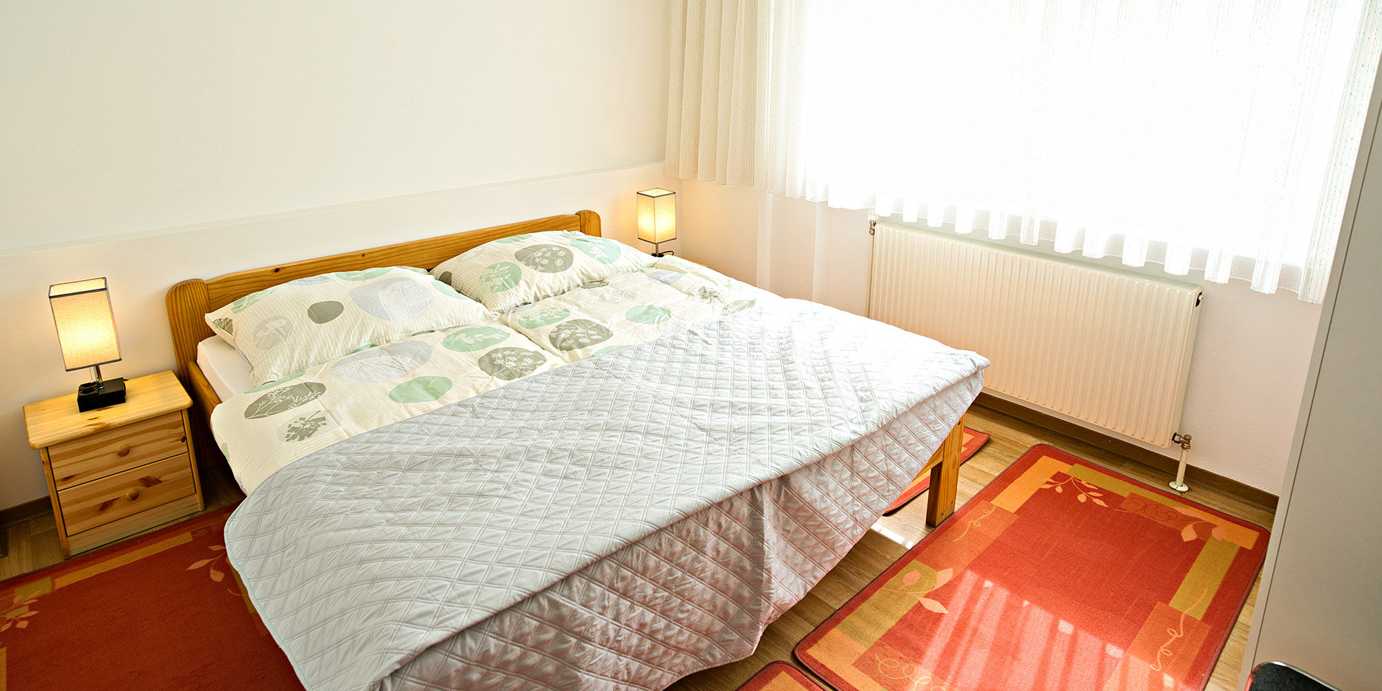 Ein 60m² großes Apartment mit zwei Schlafzimmer mit je einem 190x200 großen Doppelbett, Kleiderschrank mit Einlegeboden und Kleiderhaken. Am Nachttisch befindet sich die Möglichkeit sein Handy über USB oder per Steckdose zuladen, über die in der Nachttischlampe befindlichen Anschluss Möglichkeiten. Sämtliche Fenster sind mit Rollläden und Mückengitter versehen.