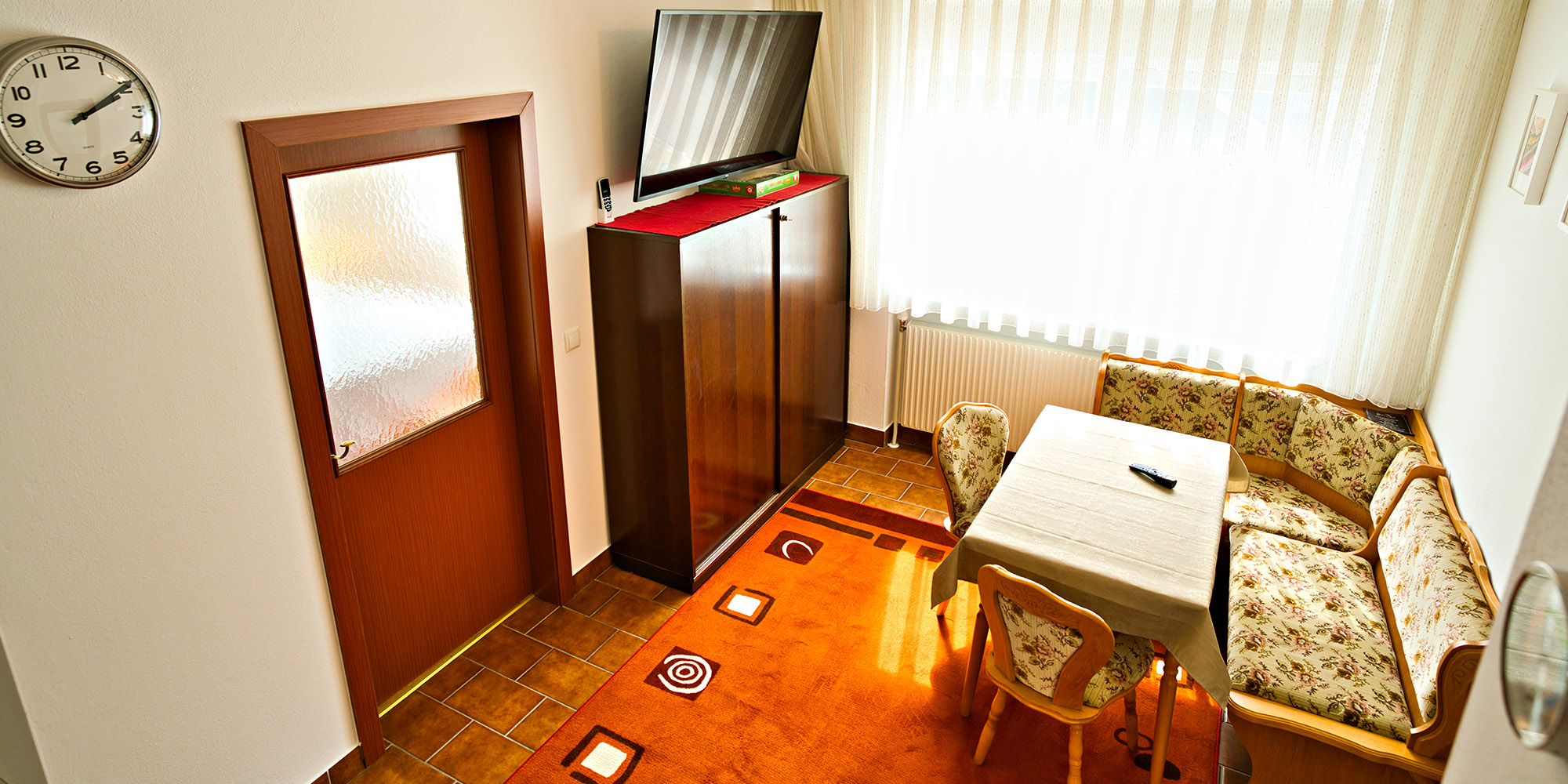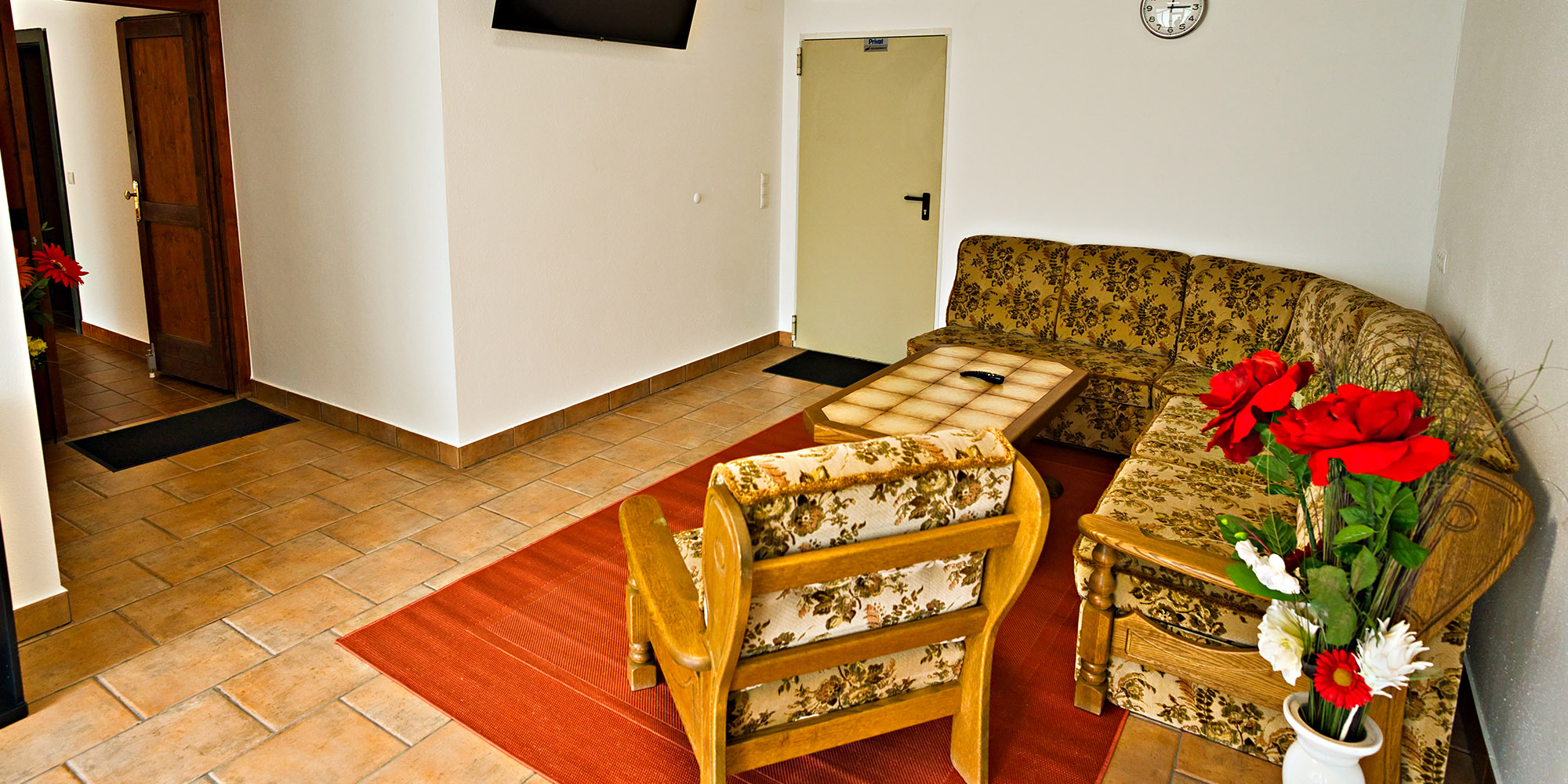 Über den überwachten Vorraum kommen sie in ihr Apartment. Im großen Vorraum können die Fahrräder sicher abgestellt und auch die Akkus der Fahrräder geladen werden. Auf der gemütlichen Couch kann man sich bequem entspannen oder auf dem zweiten 55“ Flat TV seine Lieblingssendung genießen.