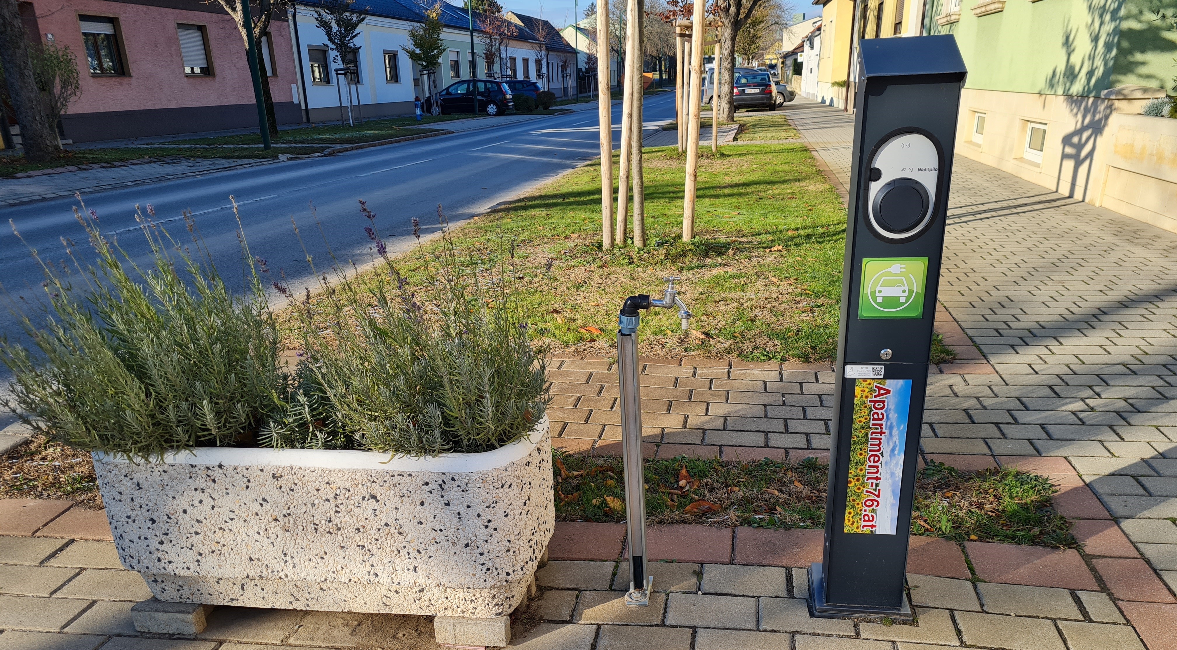 Öffentliche kostenfreie Parkplätze befinden sich direkt vor dem Haus. Auf dem Kostenfreien Parkplatz vor dem Apartment steht auch eine E-Ladestation (Fronius Wallbox) für Elektro Autos zur Verfügung. Der Strom wird aus der Hauseigenen PV-Anlage oder für das Schnellladen aus dem Örtlichen Stromnetz Bezogen.