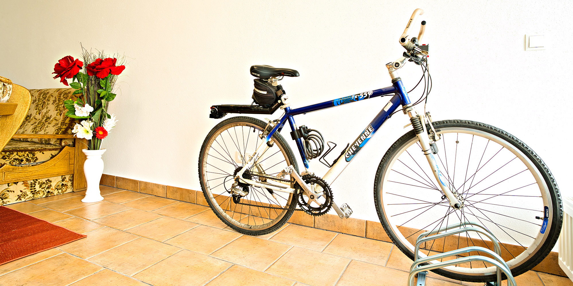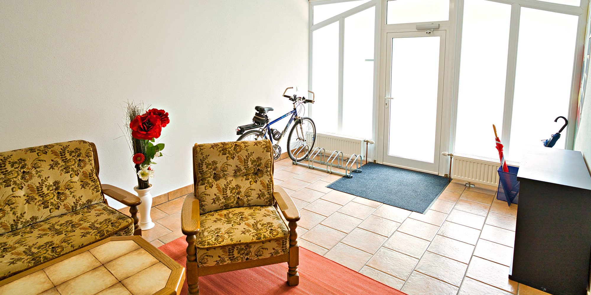 Über den überwachten Vorraum kommen sie in ihr Apartment. Im großen Vorraum können die Fahrräder sicher abgestellt und auch die Akkus der Fahrräder geladen werden. Auf der gemütlichen Couch kann man sich bequem entspannen oder auf dem zweiten 55“ Flat TV seine Lieblingssendung genießen.
