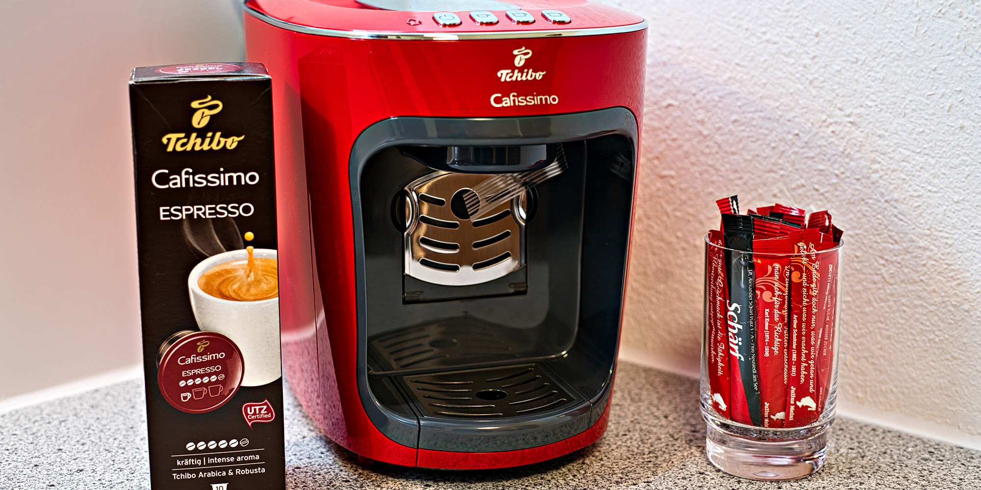 In der Küche sind alle zum Kochen benötigten Küchen Utensilien vorhanden die zum Kochen benötigt werden, Pfannen, Töpfe, Besteck, Messer, Schneidebretter, Teller Gläser, Tassen …… Auch Toaster, Eierkocher, Wasserkocher sind vorhanden. Tee und eine Tchibo Cafissimo Kapselmaschine mit einer Starterration steht zur Verfügung. Das schmutzige Geschirr übernimmt gerne der Geschirrspüler. Taps und Putz-Utensilien finden sie unter der Spüle.